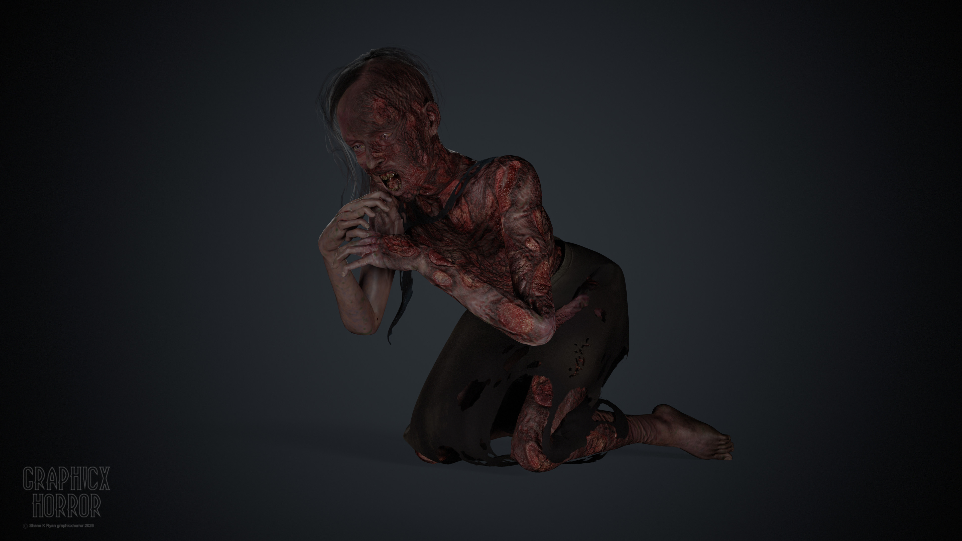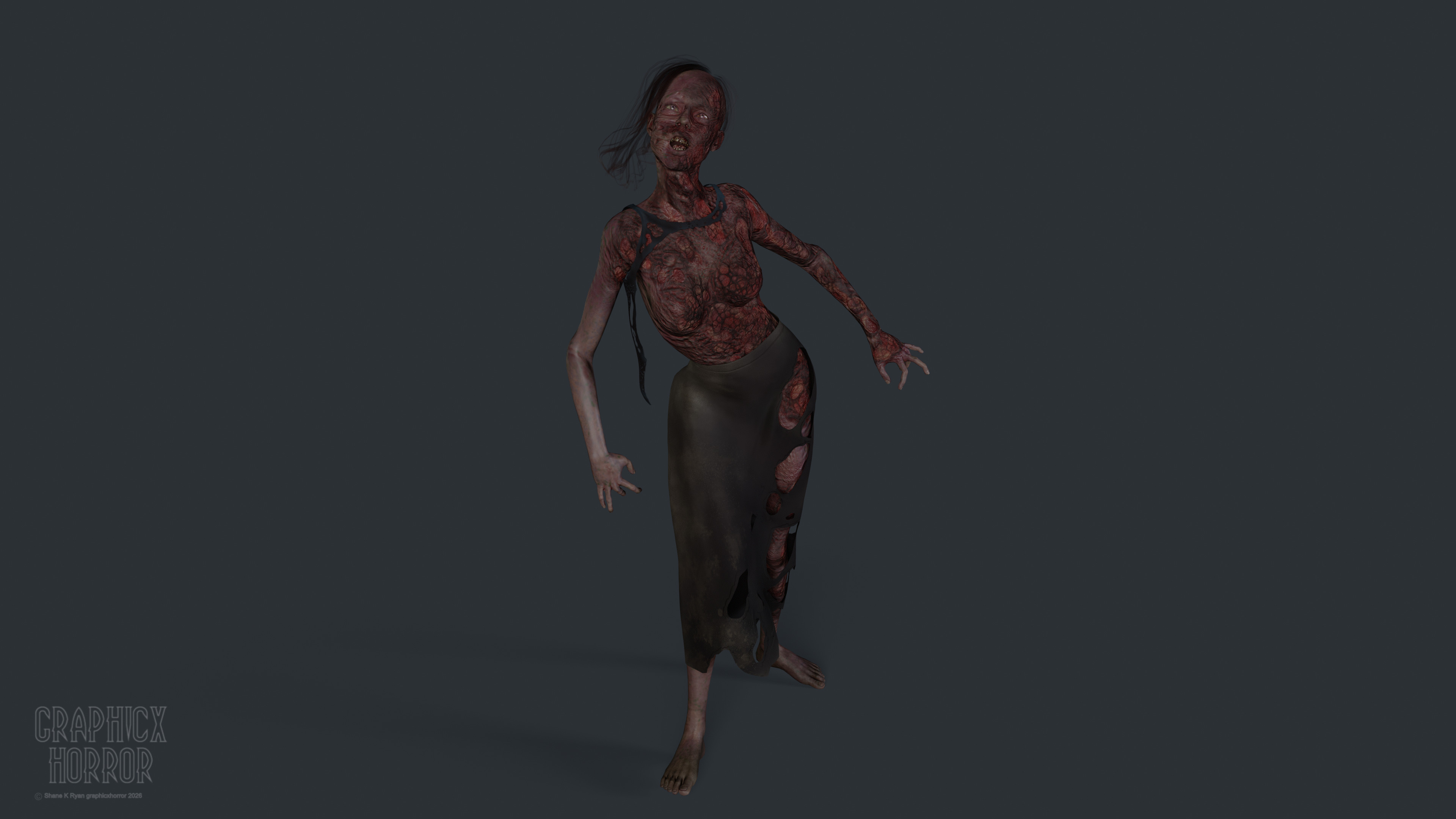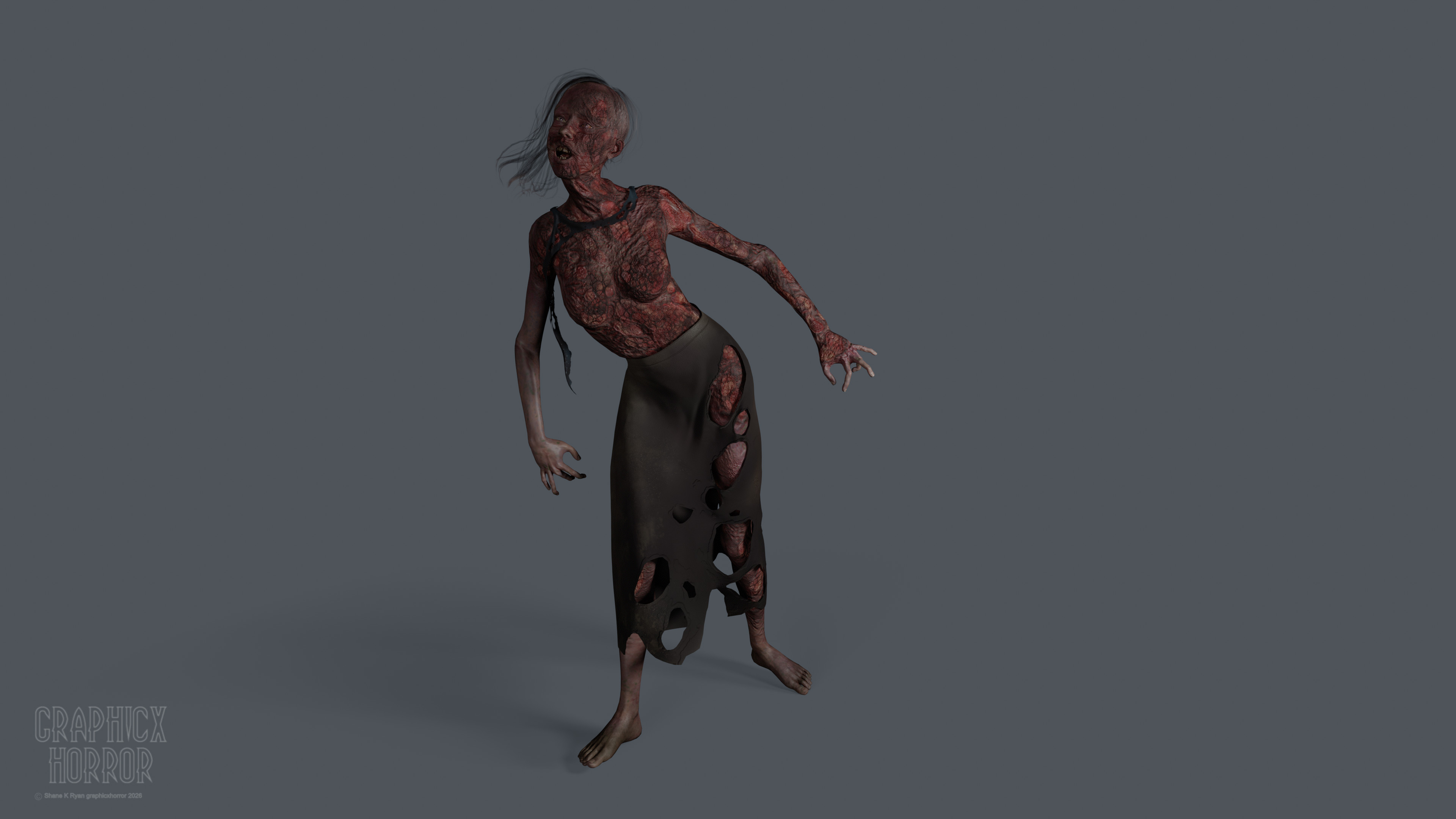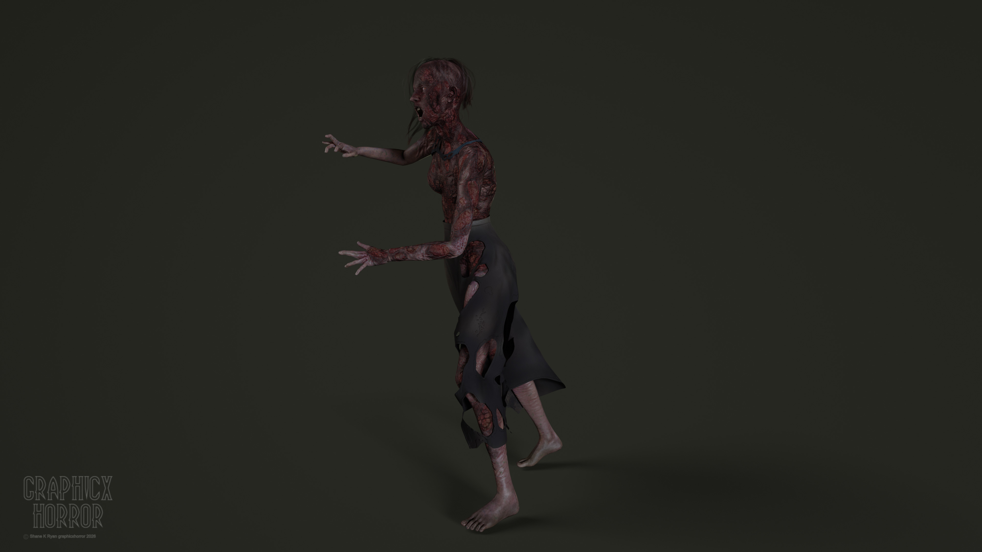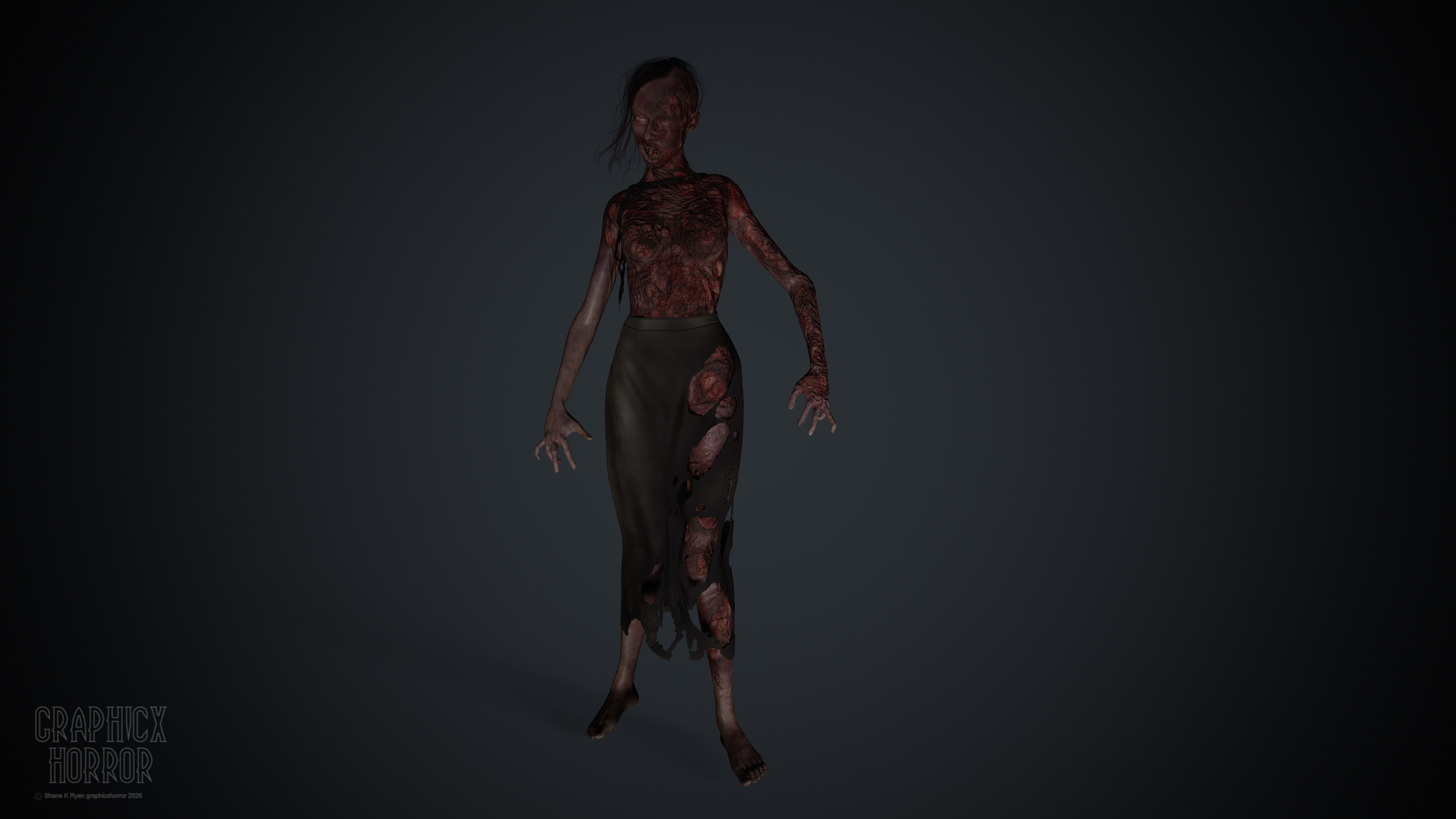 Game Ready Burnt Female Zombie. A human who was burnt and then came back as a zombie.