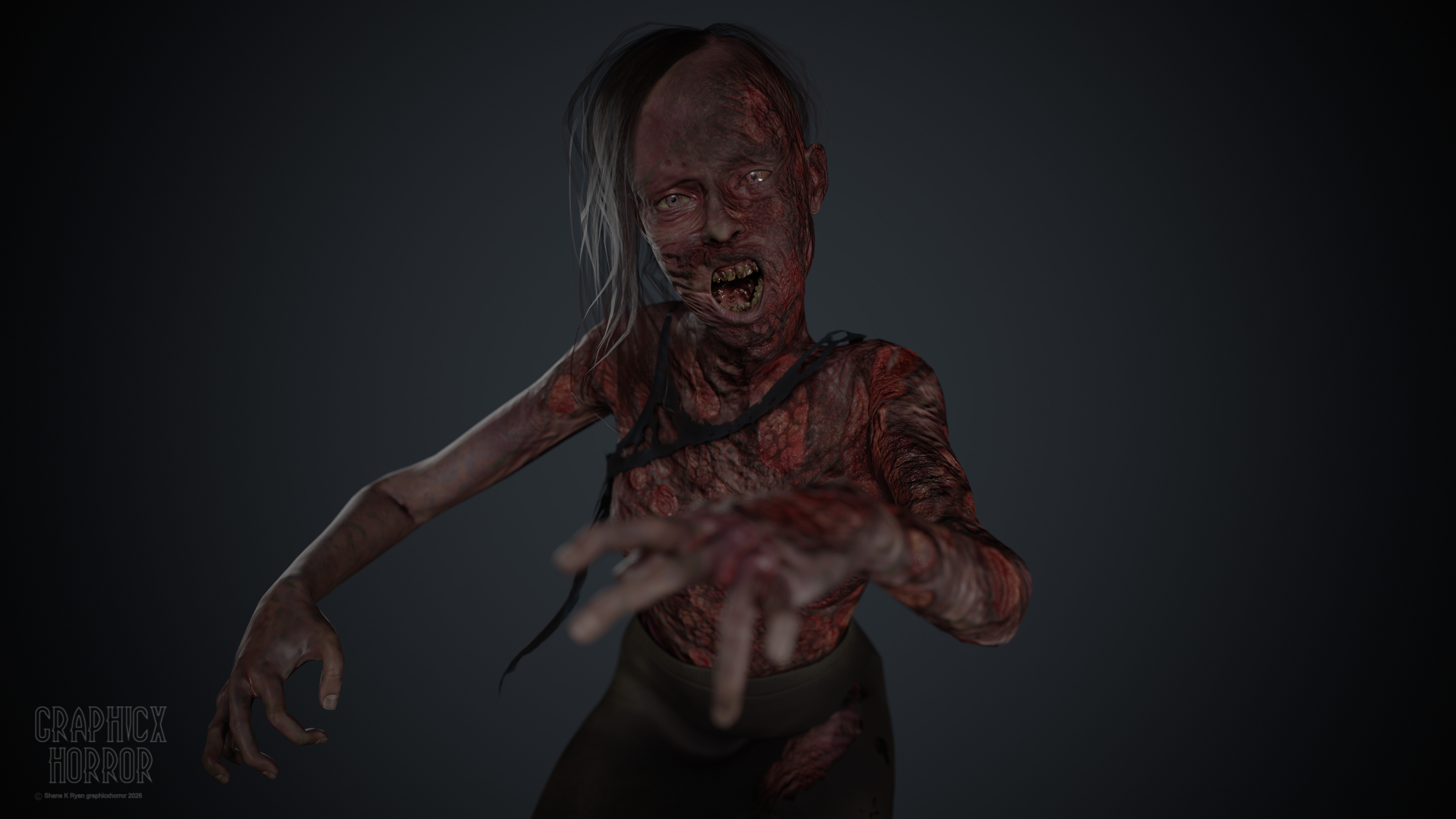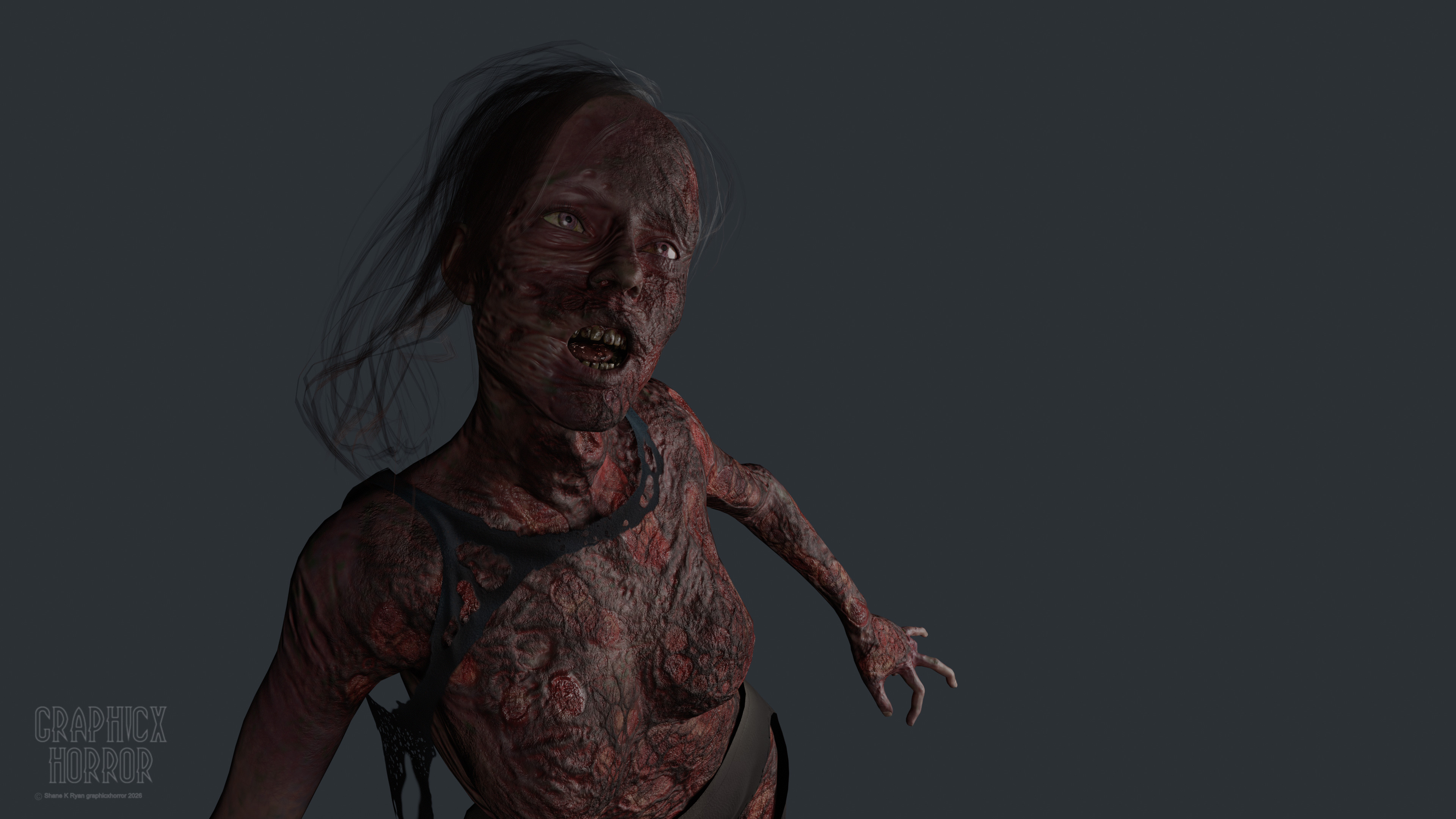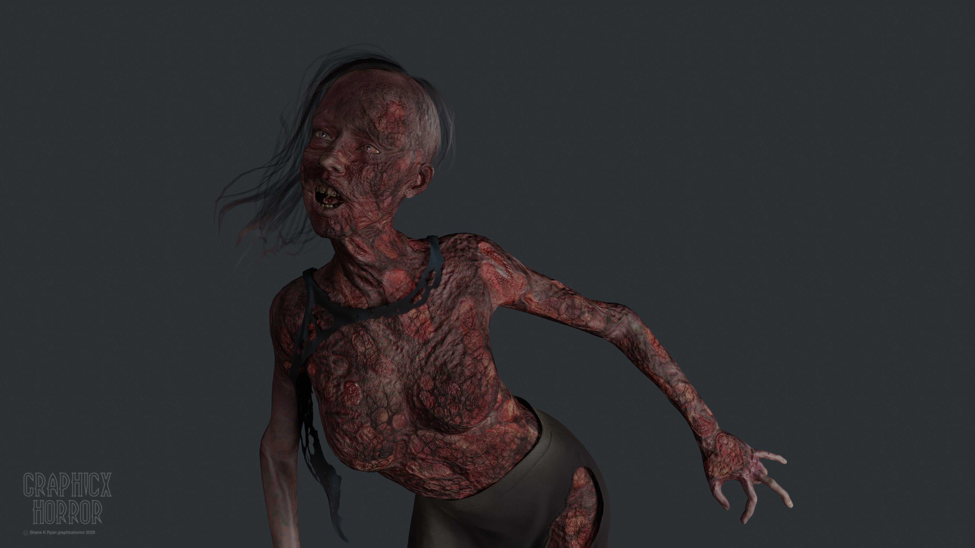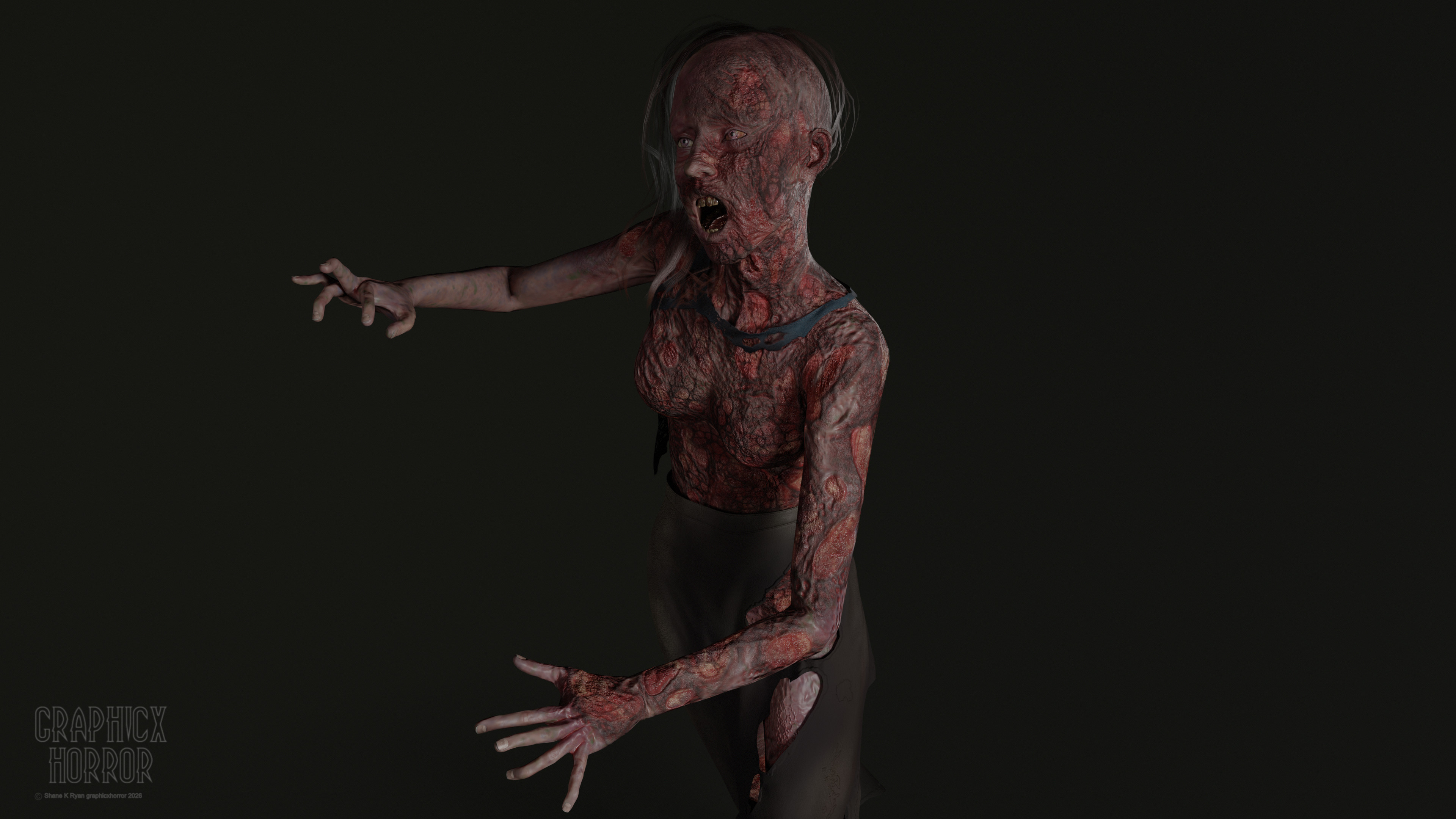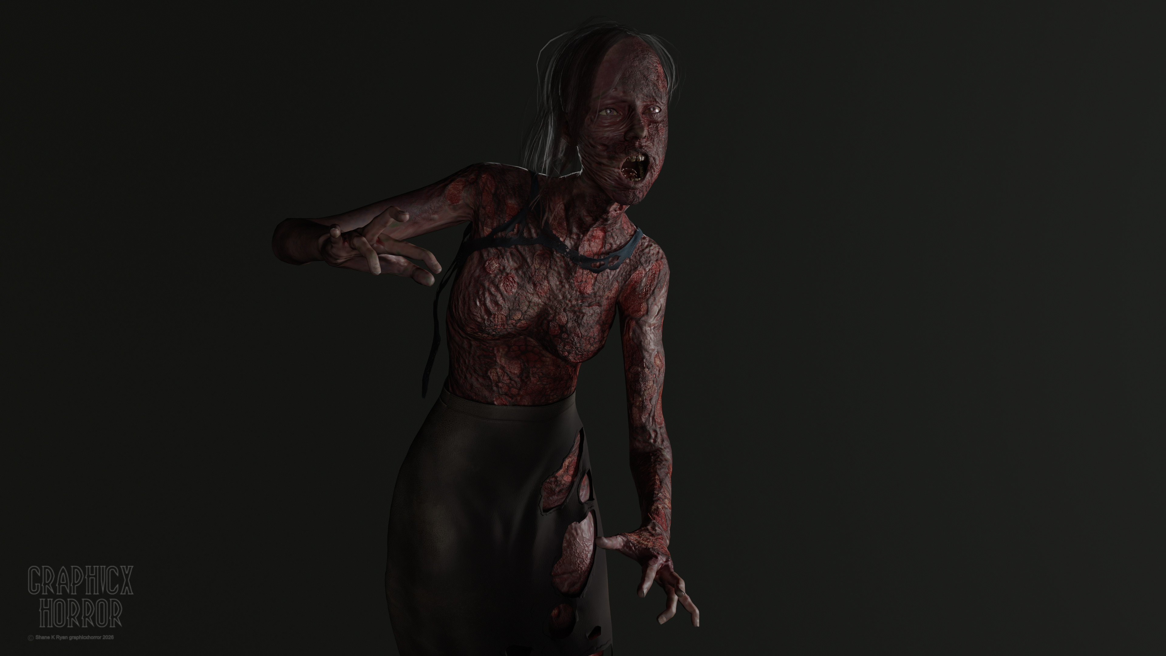 Game Ready Burnt Female Zombie. A human who was burnt and then came back as a zombie.